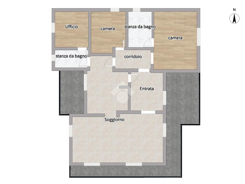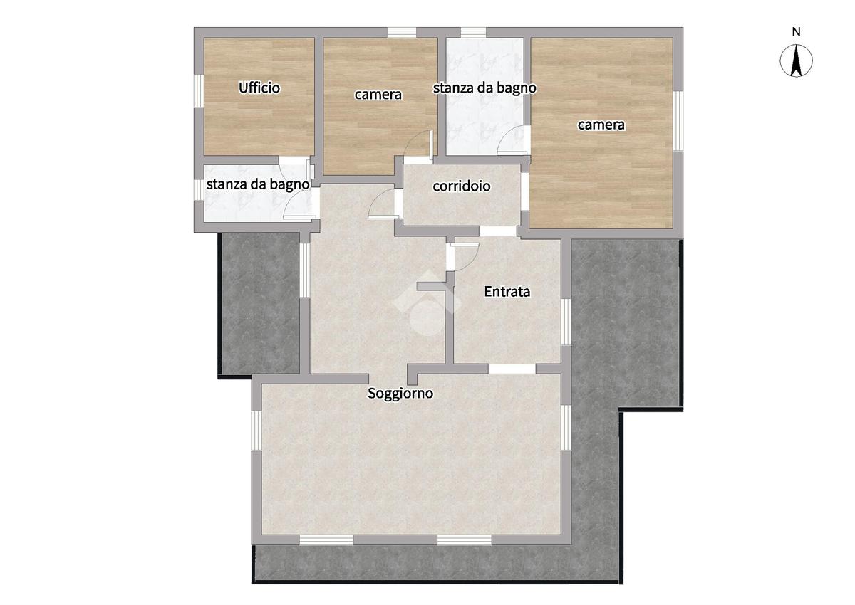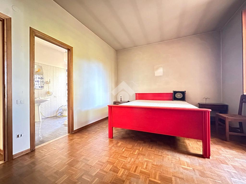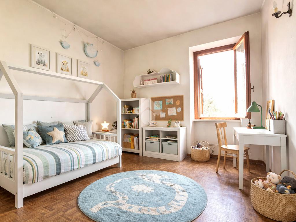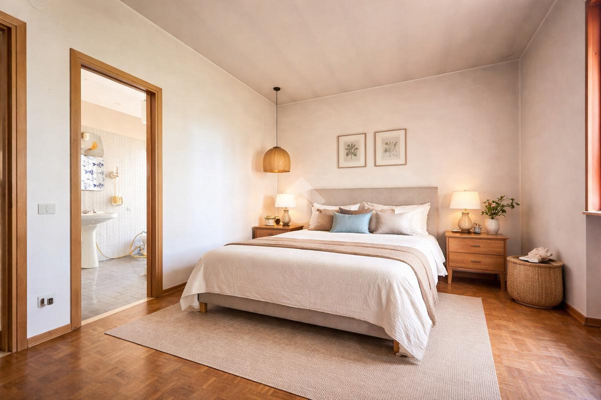 La zona notte comprende due camere da letto (una matrimoniale e una media), oltre a uno studio con accesso diretto al garage, capiente per tre automobili o utilizzabile come taverna.